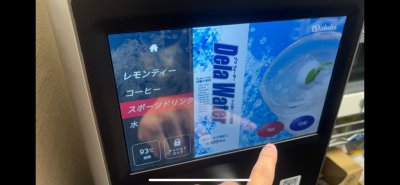 設置された機械を見ると、下のお水が光っています。コップ置きは可変式!上にはで、、電子パネル!?